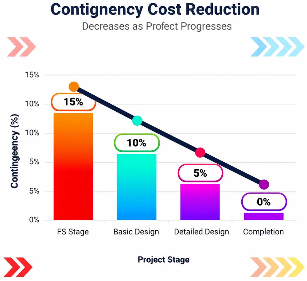 Contingencyは、工事請負会社契約金額とは別に発注者側社内予算に組み込んで管理します。Contingencyの集計には、個々のリスク発生確率(初期値としてはエイヤッと直感で決めることがほとんでしょう。)を設定し、それぞれのリスクが顕在化した場合の予測金額にその確率%を掛けて求めます。予測金額が1000万円で発生確率が10%なら100万円と計上します。そうやって、Contingency項目の合計を求めます。モンテカルロ法(詳細説明はここでは省きます。ご興味ある方はググってみてください。)を使って定量的根拠づけをすることもあります。ただ、それらリスク個別の想定費用を合計しても総額に対して大きな比率にならないこともあります。少なすぎるContingencyは、プロジェクト運営のリスクそのものになり得ますから、予算策定時、そして見直し時の設計進捗度に合わせて3%~15%のレンジを確保することが必要でしょう。プロジェクト進捗が進むにつれてリスクは減少するのでContingencyも予算管理の中で減額させてゆくのが通常です。不確定要素はプロジェクトによって異なるので一概に言えませんが、例えば、FS段階で15%, 基本設計段階で10%, 詳細設計段階で5%等々です。